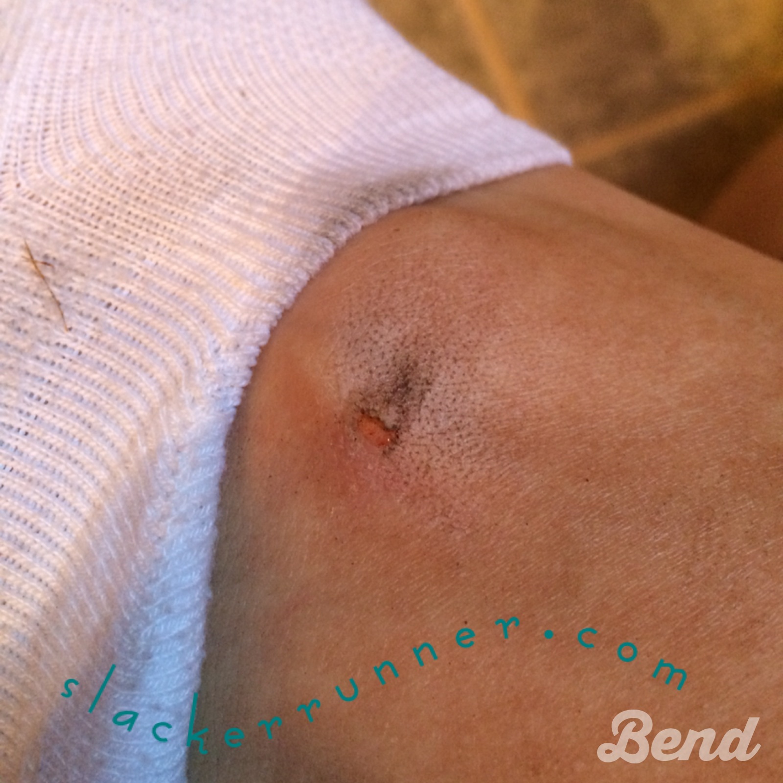 It is pathetic how sore I was after yesterdays run.    My thighs were making themselves known to me all afternoon and this morning.  They say you can take a week off with no real harm but that apparently applies to people much much fitter than myself.   This theory was reinforced today by the picture below.  Seriously, what kind of talent does it take to kick yourself while running?