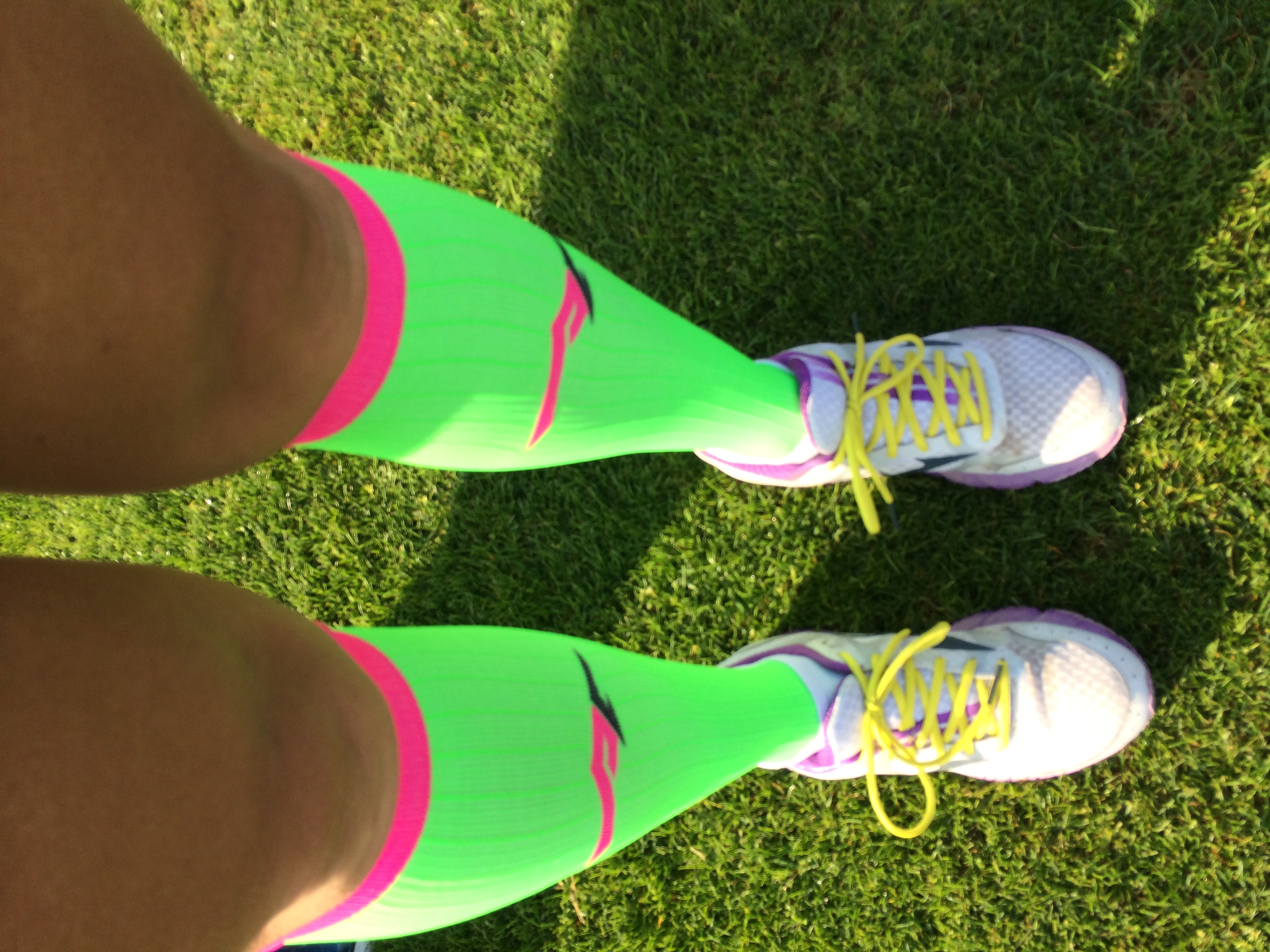 I picked up my packet yesterday and other than not being sure where to go, it was a breeze.   They had everything ready to go and packaged, even the safety pins.  As I got ready this morning, I felt predictably a little ill- my own fault- but I was trying to pump myself up.  So out came the bright green and pink compression socks.  The shorts I had wanted to wear were dirty-oops- so I randomly chose another pair.   I was flying solo this race, so I had an available passenger seat.  They make a great staging area.  Please tell me someone else has done this?