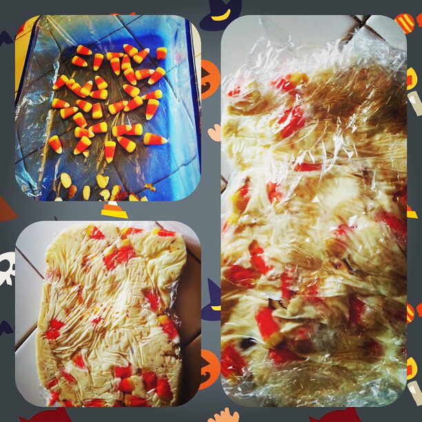 I saw a recipe for Halloween Bark over at backatsquarezero.com. Let me preface this by saying I have no talent in the kitchen. None. But this only had 3 ingredients, I thought I could make that. Yeah, umm no. Did you know chocolate could burn? In a microwave? I didn’t. After that I had to scale back the amount I was making. I sort of stumbled through the rest. The end result- not pretty. But damn tasty! I took it to work and we ate all of it. 🙂