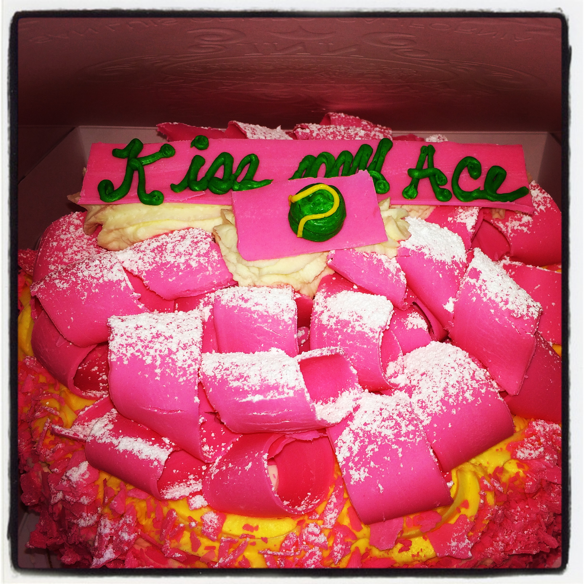 The cake was a gift from her tennis players- her favorite flavor and a phrase of their choice. 🙂