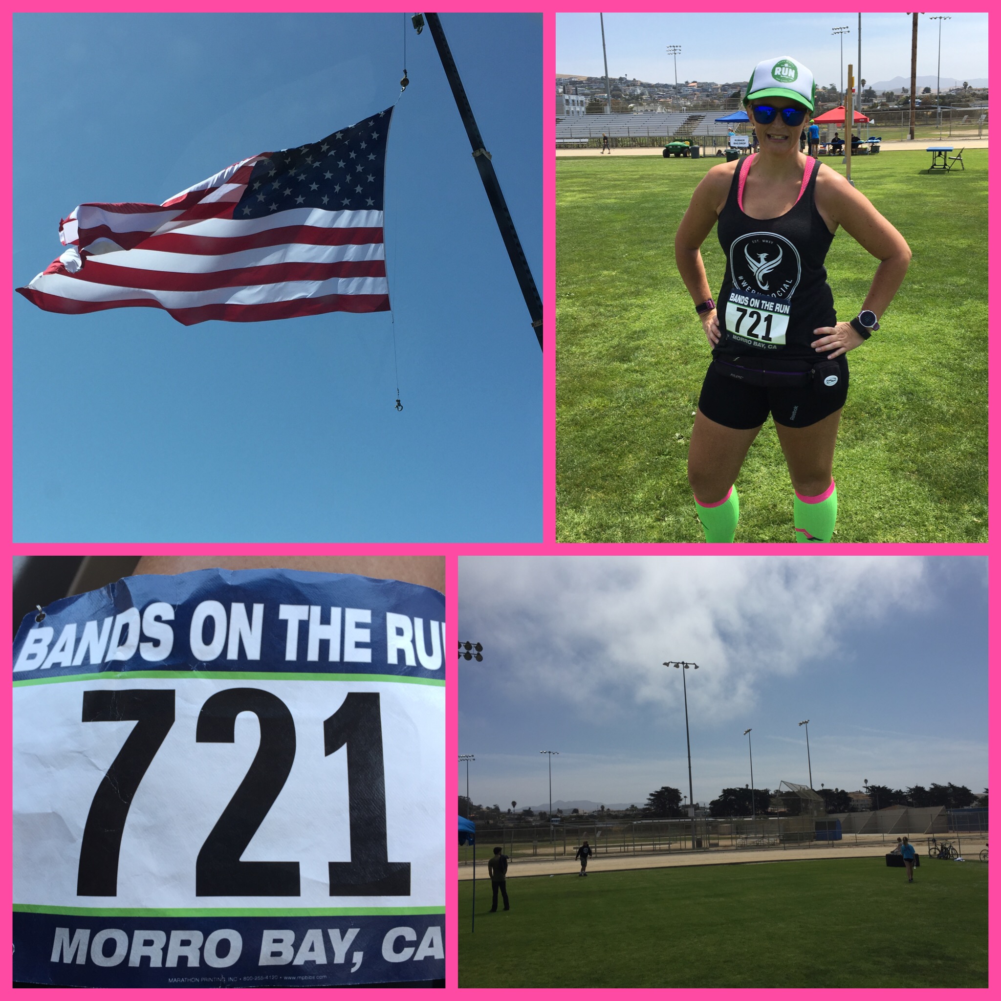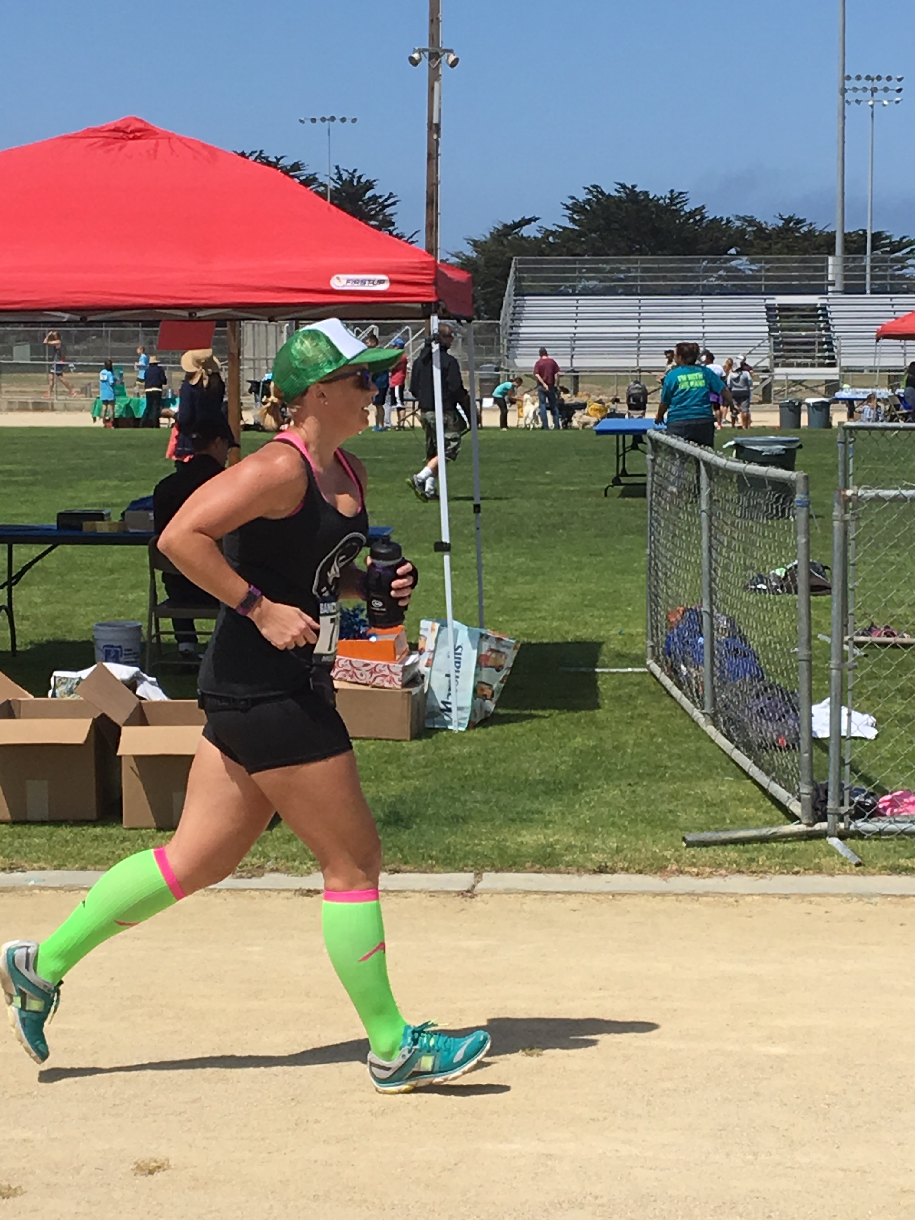 Packet pickup took less than 5 minutes on Friday and that included parking. πŸ˜ƒ I was able to get what is a decent nights sleep for me pre-race- 6 hours- but that was only because the race had a late start. The races started at 10. 10? This is California! I have never had a race start that late. Most half marathons start at 7 or earlier, 10K’s around 8. If you’re really lucky, a 5K may start at 9. Maybe. I have troubles fueling properly on a normal basis, how the hell do I fuel for a late 10K? I know that beach races are dictated by the tides though so this must have been the best option. It was ridiculously cold when we first got to the high school so I was optimistic it would stay that way. After a fitness warm-up, the presenting of the flag, the Pledge of Allegiance and National Anthem, we lined up and were off!