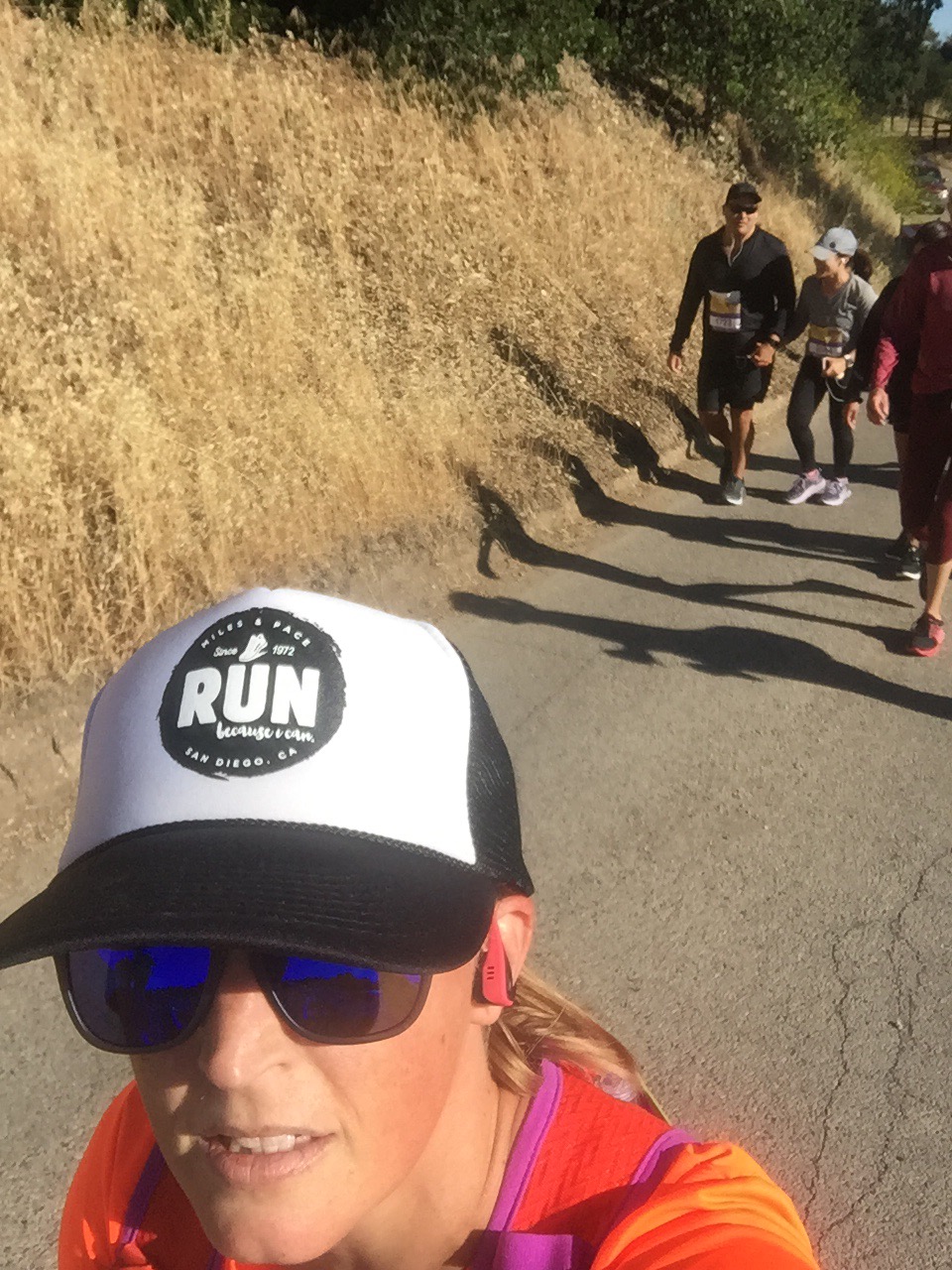 Thank you downhill! I caught up to Ashley and her group again, said hey and continued running on. We were now running through vineyards which I love but it was a little warmer than I would have liked. Correction, I shouldn’t have been in long sleeves even though I was thankful every time the wind had a crazy strong gust. đ I took my phone out around mile 9 to take a picture only to see the low battery alert and that it was at 10%. What the hell?!? I sent a quick text to my mom letting her know I was turning it off, shut off my music and turned off my phone. Boo. I also realized 2:25 wasn’t likely anymore.