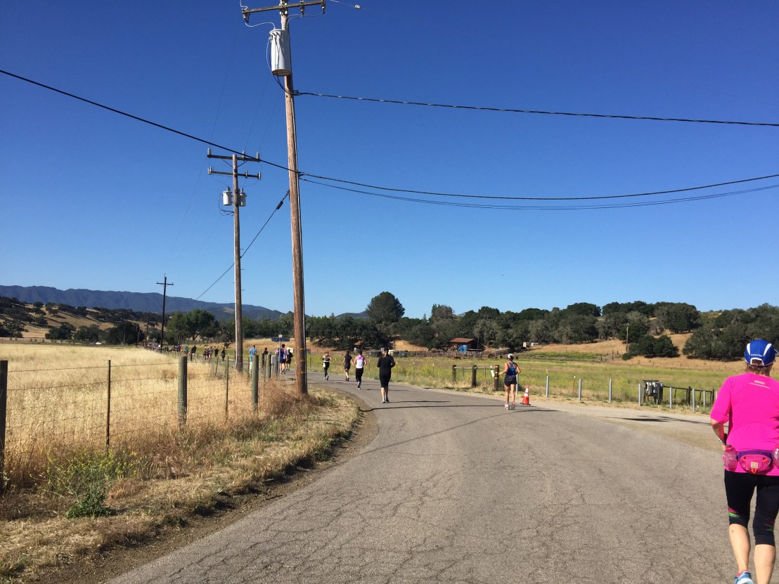 I was staying steady, sluggish but steady and that was fine. The course so far was more back roads and neighborhoods, I was waiting for vineyards. I was actually surprised that the roads were completely closed- it was awesome but I was surprised- I’m only used to that at races with much bigger crowds. A little past mile 5, we were running into the town of Los Olivos- it’s so small, it’s so cute! Crowd support picked up too because mile 5.8 was the relay transition point. I won’t lie- getting a medal at 5.8 looked pretty awesome. I knew we were almost to the end of the “climbing” section but since the uphill hadn’t been so up, I wasn’t counting on much of a downhill.