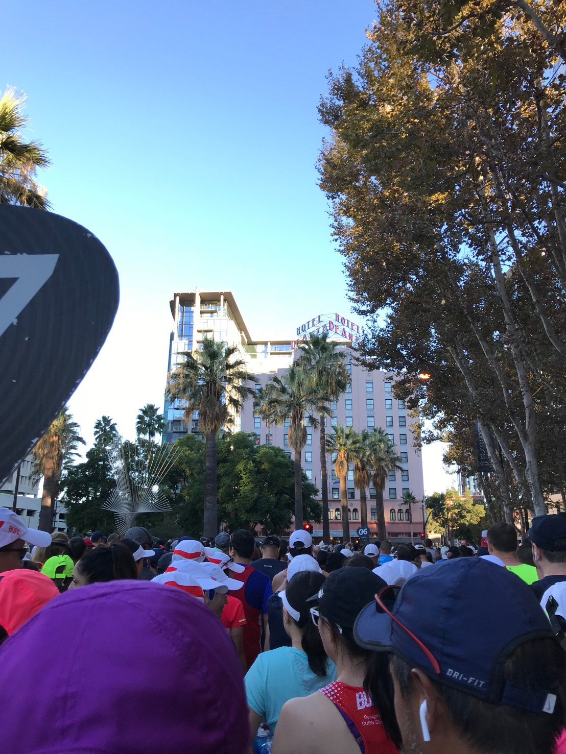 Irritation fueled the first mile. I had a feeling I wouldn’t be able to maintain that. My legs felt ok but the rest of me felt off- just kind of not present. I was running and felt like I was pushing but I knew I really wasn’t. I was realizing just how many turns this race course was going take. We turned so many times. We ran through the San Pedro Market area which brought us past the Spaghetti Factory- nope, nope. Then it was another turn and we were coming back towards the start line. I heard a woman tell her running partner that it was too hot for her.