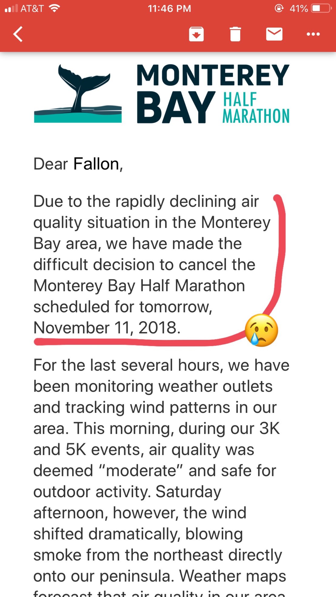 Sad times. 😦 Sorry to hear that the race was cancelled, but at least you won’t inhale terribly polluted air. 🙂 I ran once in high school when there was a fire in my city and I got sick the following day. It was really bad. 😦