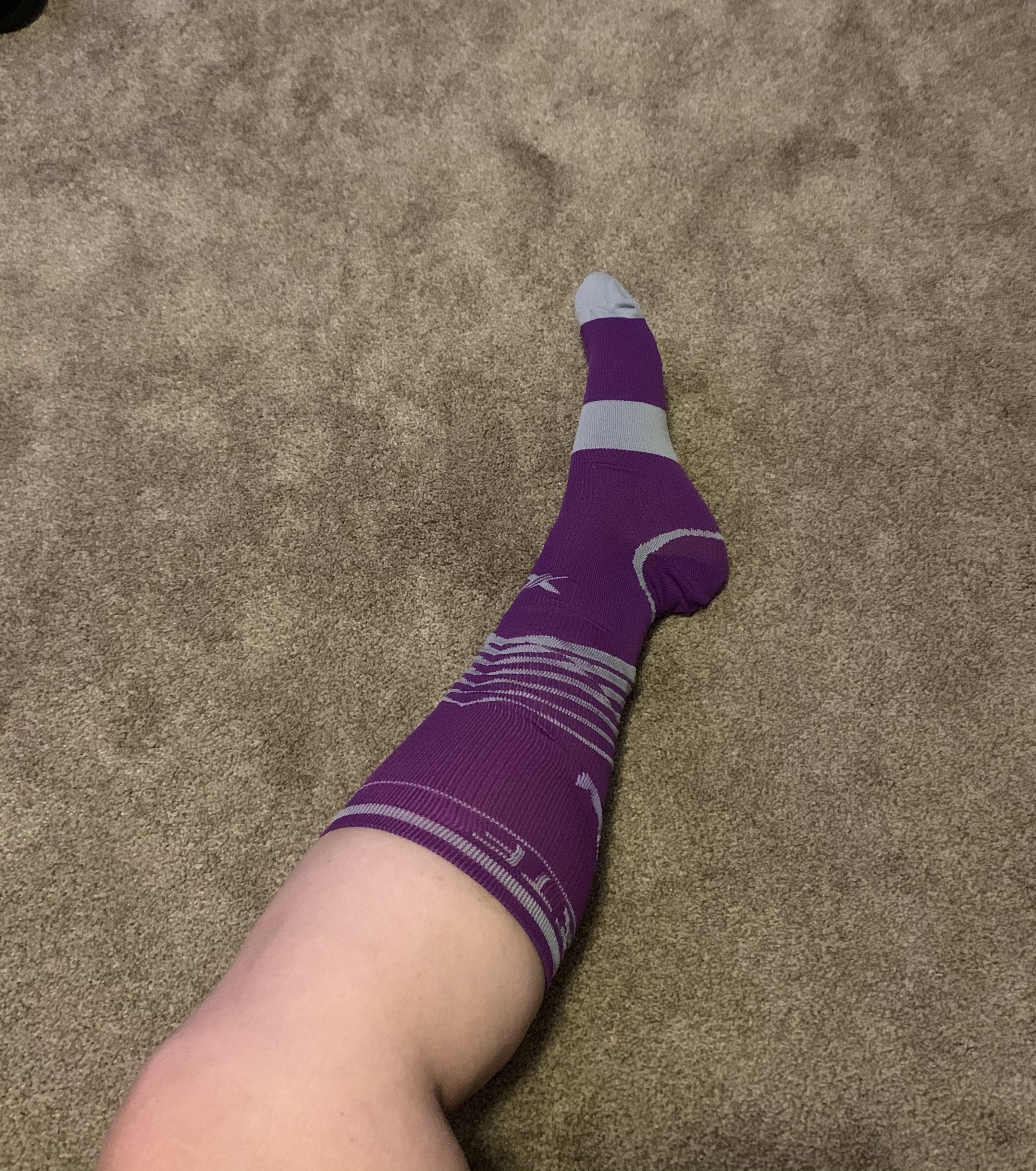 Now here’s where things get tricky. If you by chance read my last post, you know I have put on some weight. That includes my calves. Which puts compression socks and I in a complicated relationship. Knowing that I sized up to the L/XL.