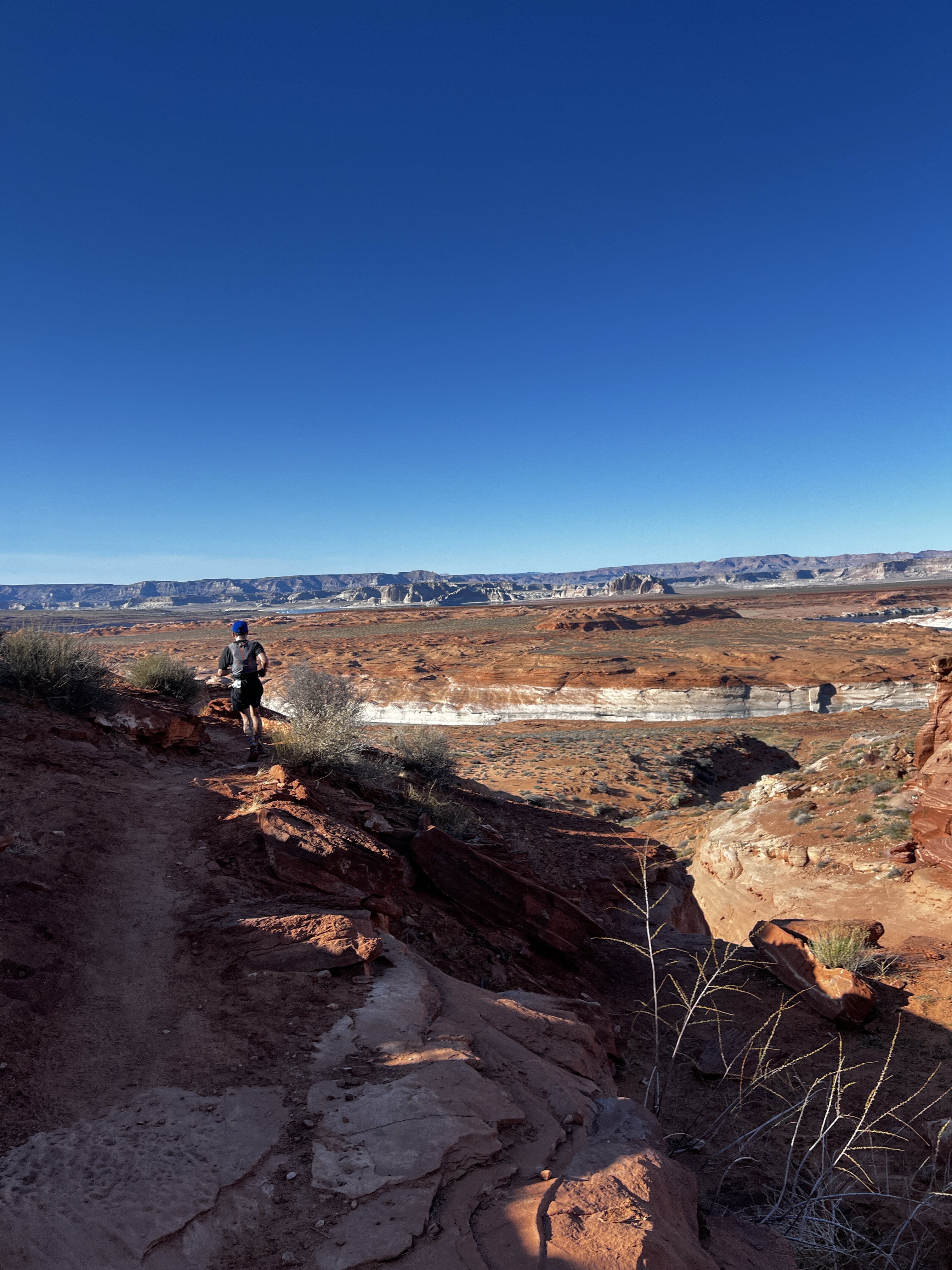 By now, I was about 20 miles in, and the steepest climb of the day was ahead of me and I was so over it. We made it up to the top of the 10-mile loop, which was hard-packed trail. Hallelujah. That part was amazing. At least it started out that way. My mother pulled ahead of me again, saying she had stomach issues and I was just slogging it out. Honestly, I was kind of in a dark place for this 10-mile loop. It’s about 100 feet in the air, right on the edge above Lake Powell and dark place me was thinking about how easy it would be to fall over the side and just be done. Not good. At this point, we were almost three hours over when we thought we were gonna finish, and only around mile 25. I had been in the sun for longer than I had planned, and I was mentally going down. I continued my way around the upper loop, just struggling it out. I realized I had stopped sweating and was turning clammy and becoming super shaky. I was having serious issues.e