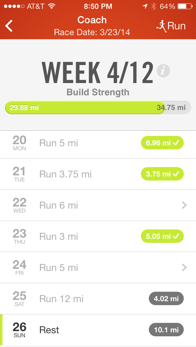 Back in February, I had a few issues with my legs not feeling so good. I figured it was caused by overuse as the training plan that I had been following was a little overeager. The mileage that it was calling for was a little intimidating. 40 mile weeks are great for some people and in theory I like them, but come on, Slacker over here. Weeks 2-5 hitting 40 was yowza! I never actually hit that mileage but I was running more than I was used too. After the ugliness that was the Heart & Soles 10K, I took a week off resting my ankle, Achilles and basically my left leg and started fresh with a new plan. A Slacker Plan. I tried using it leading up to my half in March and I am planning on continuing with it through SLO and for the beach half I want to run in May (doh!).