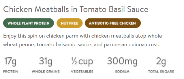 Next up was the Chicken Meatballs in Tomato Basil Sauce. Holy, yumminess. And my 5 year old palate didn’t have to avoid any ingredients. I adjusted the microwave time and the whole wheat penne pasta noodles were perfect. Plus I was still eating veggies!