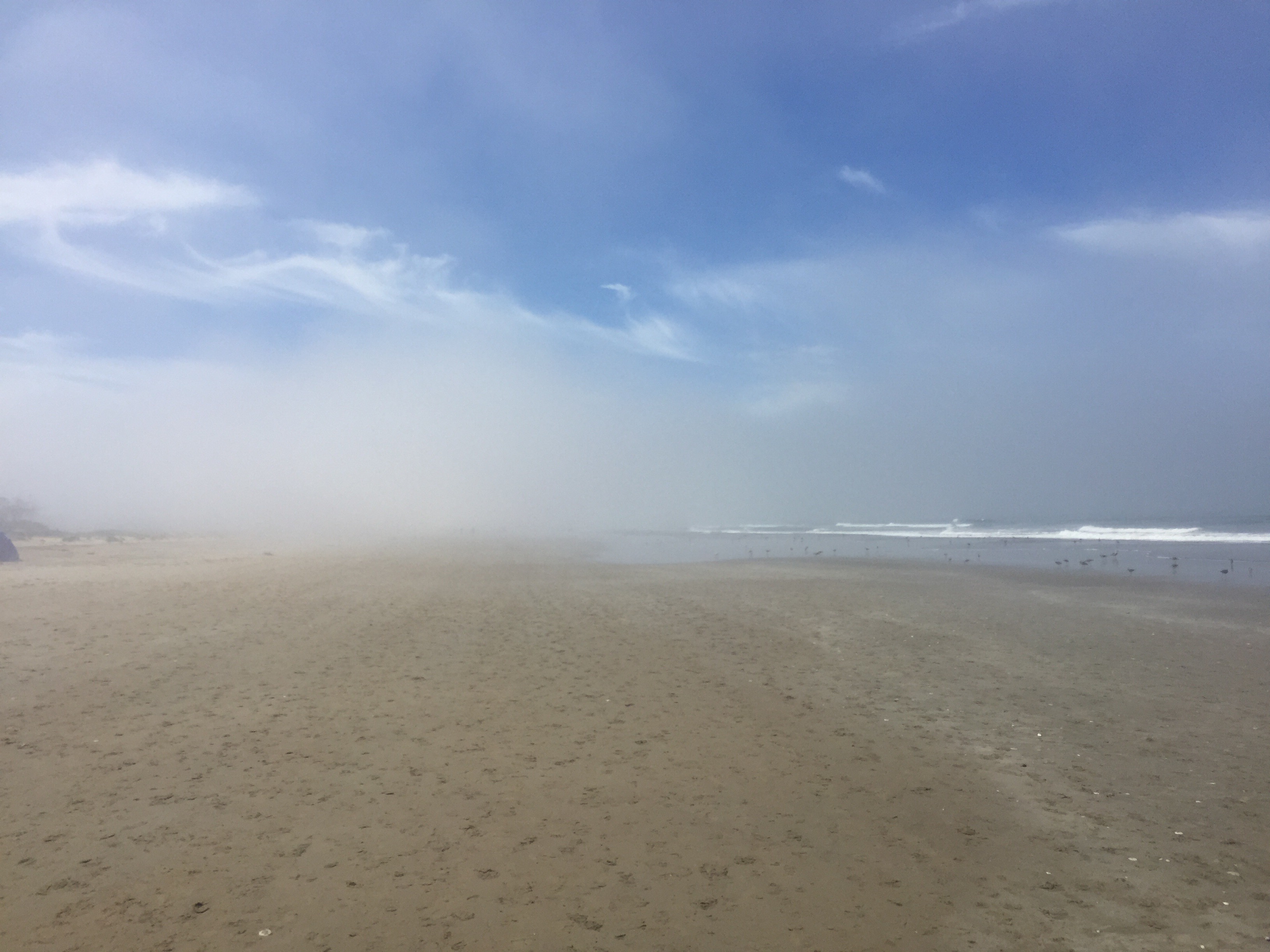 The rock patch the second time through was sketchier- by now I was mostly by myself and there was no one to follow. Plus I was tired. But I made it and knew I had less than 3 miles to go. The fog was so dense, I was beginning to worry I was going to miss the turn off to head up the beach for the loop around the park. Someone came up behind me and passed me so I just followed them. Between the rocks and sinking in the dune sand, I had slowed to a crawl but I just kept moving. 14:33, 15:59, 14:16