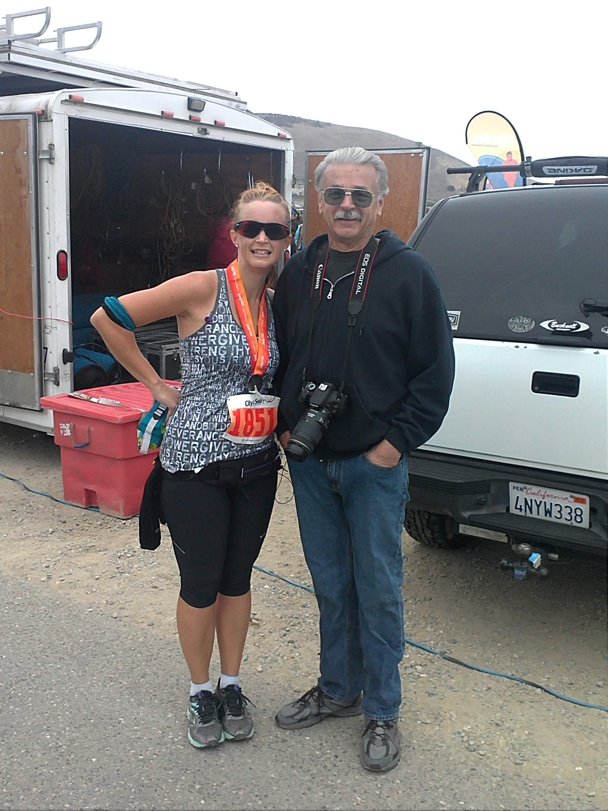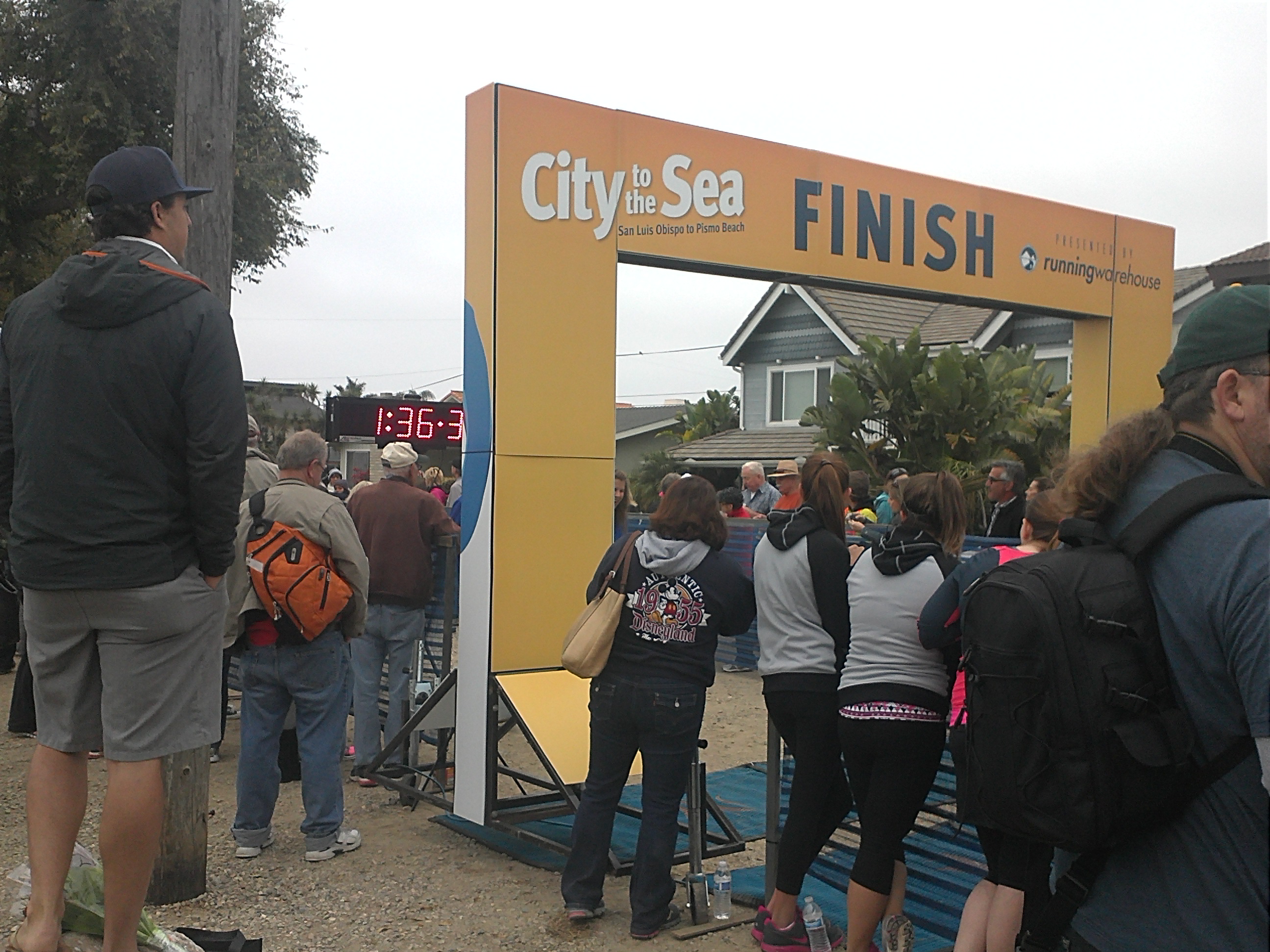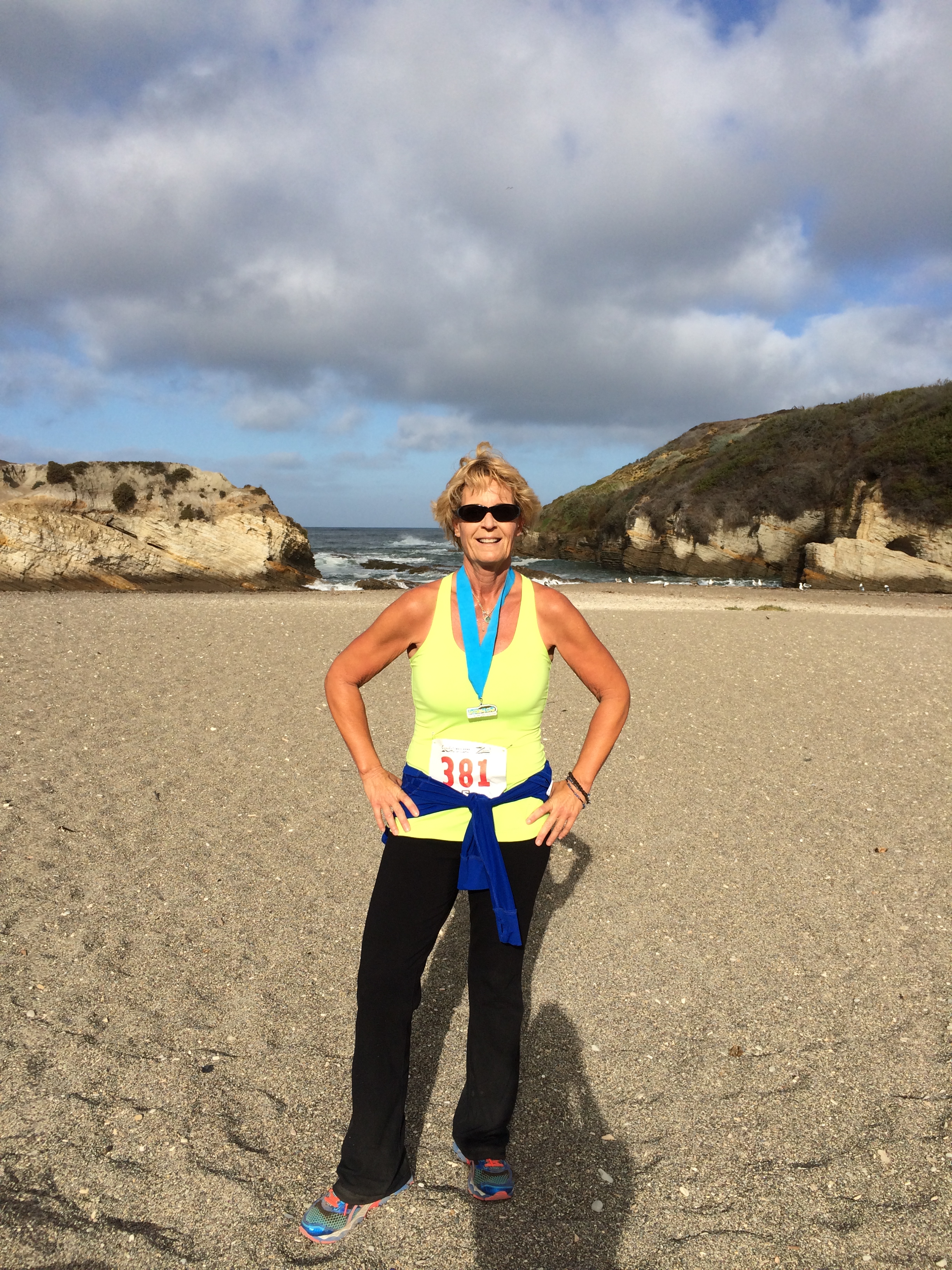 We ran down the hill, and across the finish line. We crossed at 1:06:??. My phone was in my jacket pocket and by that time it was tied in knot around my jacket. I couldn’t get it to stop it, so I am unsure of what the exact time was. My mom is a bad ass and finished her very first race ahead of me. And it was a hard one. She just kept pushing. We got our medals and were stretching by the cove when she asked when the next one was!