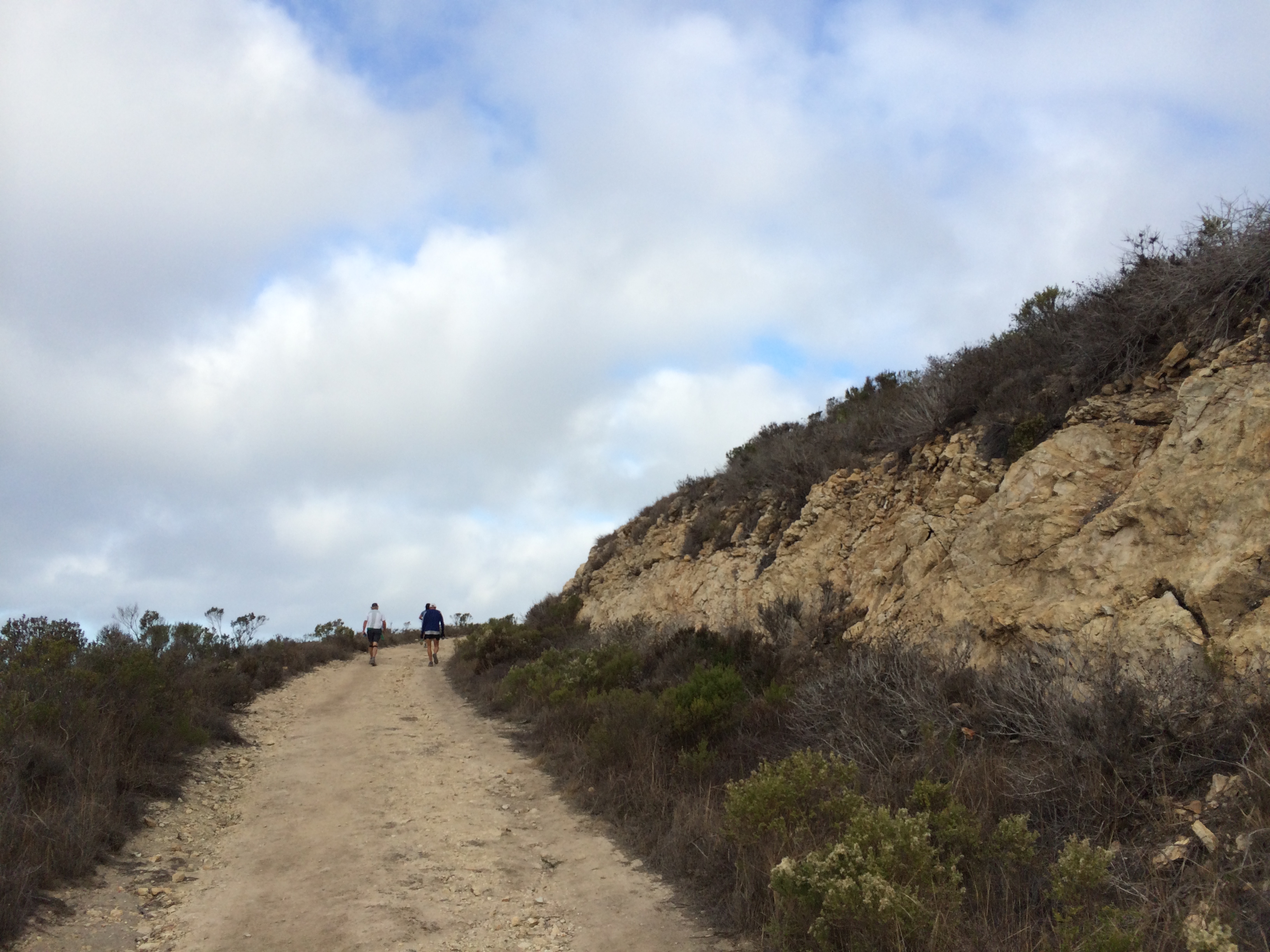 The area has had very little rain. The last time I did Valencia Peak, the mountain path was hard packed. Not so much this time. The sand was very loose; we were either sinking in it or sliding on it. That did not help our time. We finally hit the split, the 7 miles, 25k and 50K runners continue up the mountain another mile, and the 5 milers headed back down. At this point, we had about a mile to go.