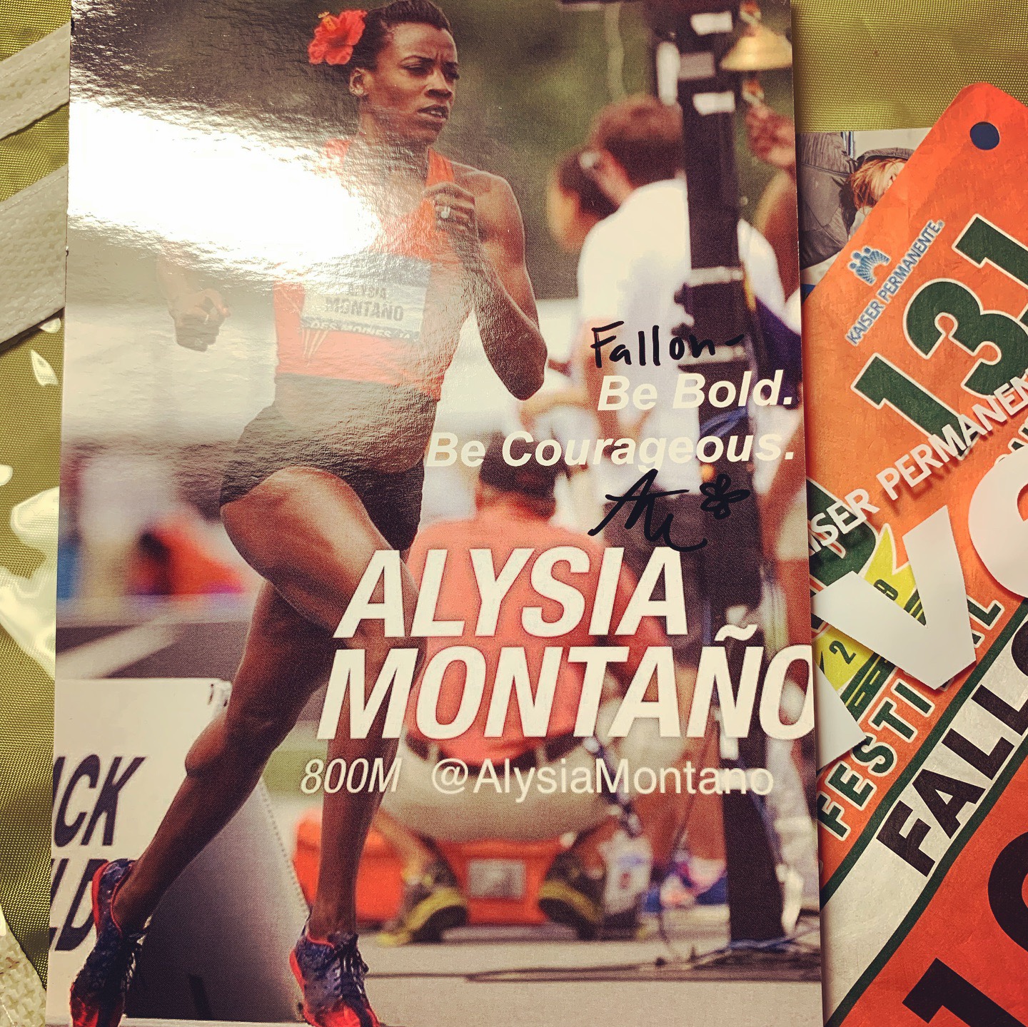 I felt a little more rested as I was able to sleep longer than normal before heading up towards Oakland. It took around hours and I only had 1 missed exit, ha, but I made it to the expo area around 2. Instead of going directly there, I decided to drive to the start line and check out the area for the next morning. That didn’t take long and I was dropping my car with the valet at the Marriot all to soon. That hotel is deceptively large and the expo was in the Convention Center. I picked up my bib, wandered around and then wandered around again. Bought a shirt, was able to get my shirt AND medal from the canceled Monterey Bay Half last year and met an Olympian!! Alysia Montano was at one of the booths and I got her autograph! Y’all this required so much stepping out of my shell. Then I couldn’t kill time anymore but the hotel let me check in early and then I just crashed. I ordered food from the hotel and never went anywhere. The coughing was becoming a thing.