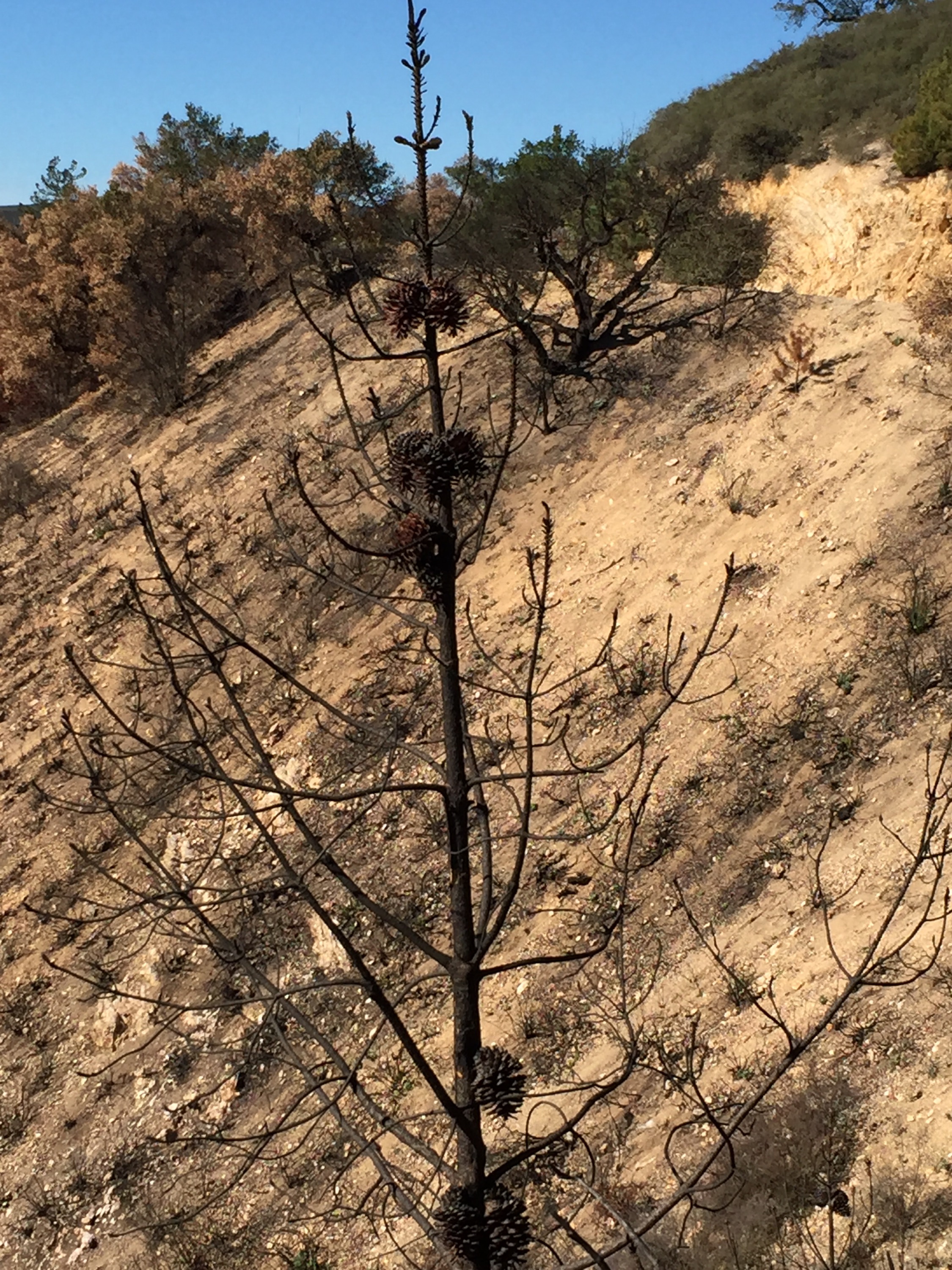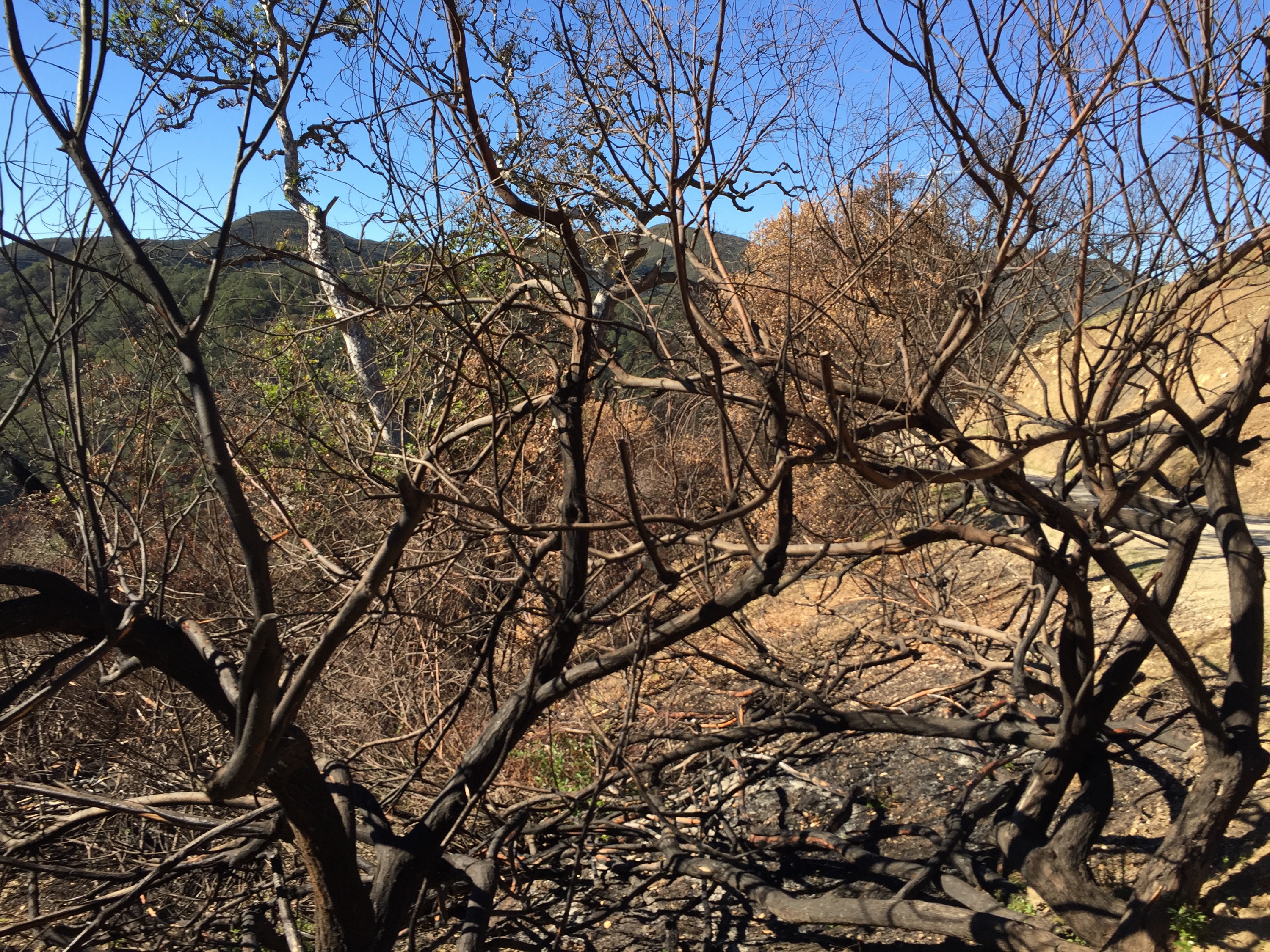 Overall, things looked better than I had expected. It’s interesting how much it seems that fire has a mind of it’s own. Two sections could be black and charred with a healthy, so to speak, section in between. You could see where nature is making a comeback. Which is awesome, but if we have the El Nino they are predicting the charred sections are likely to turn into slide zones.