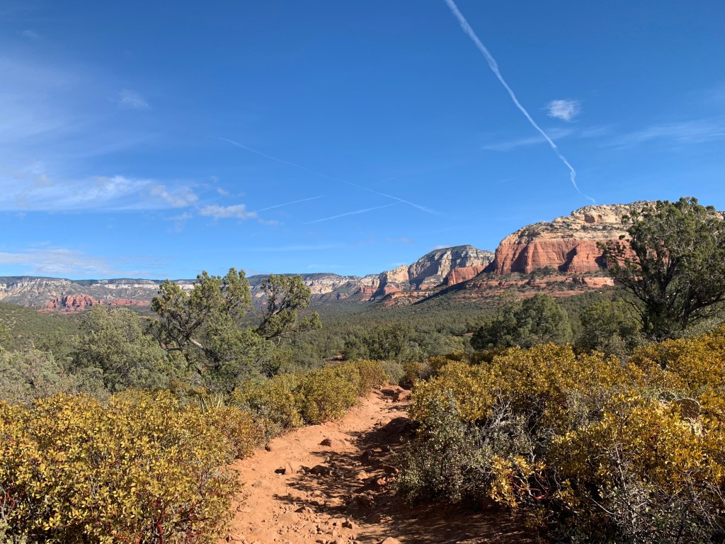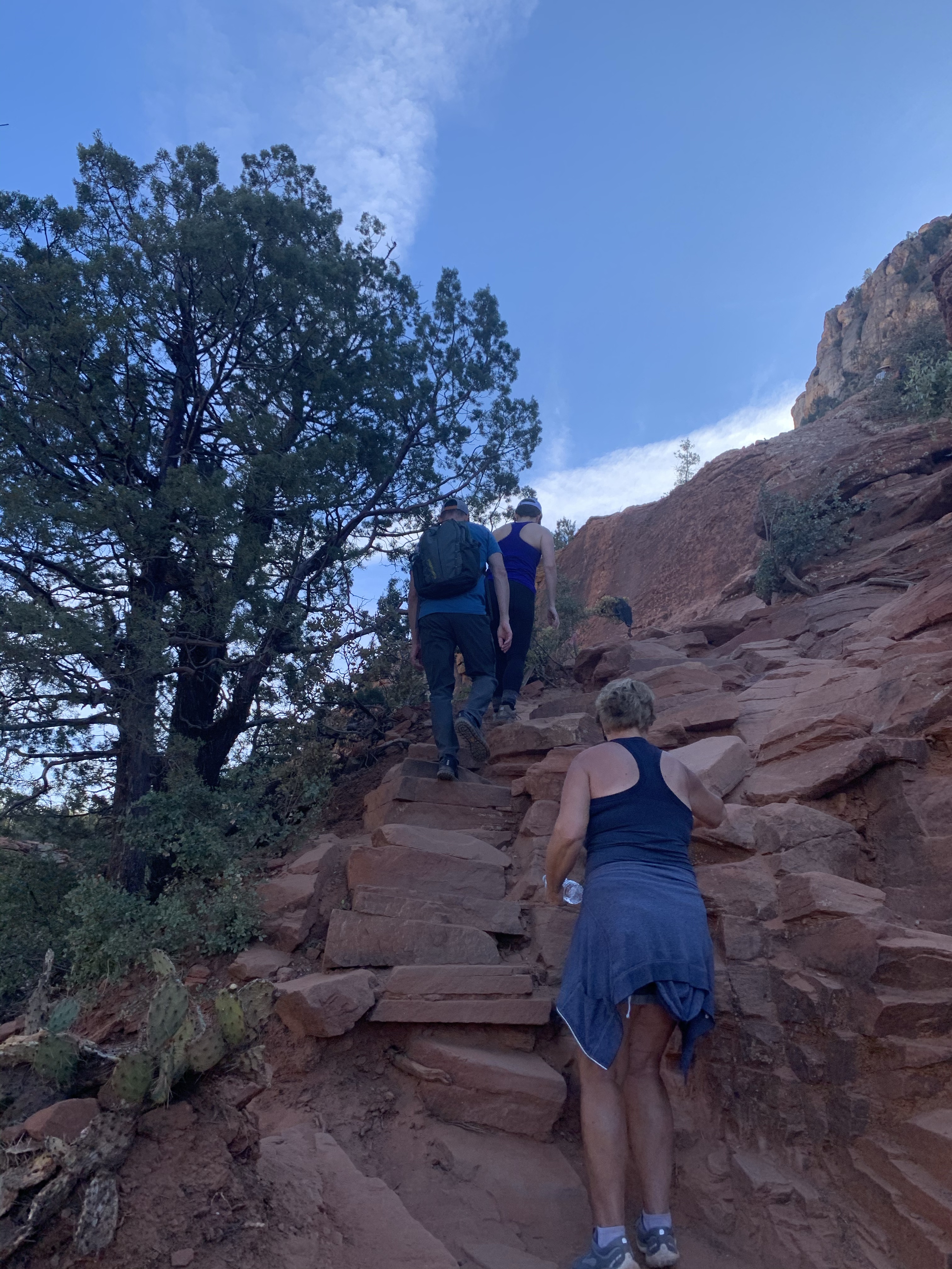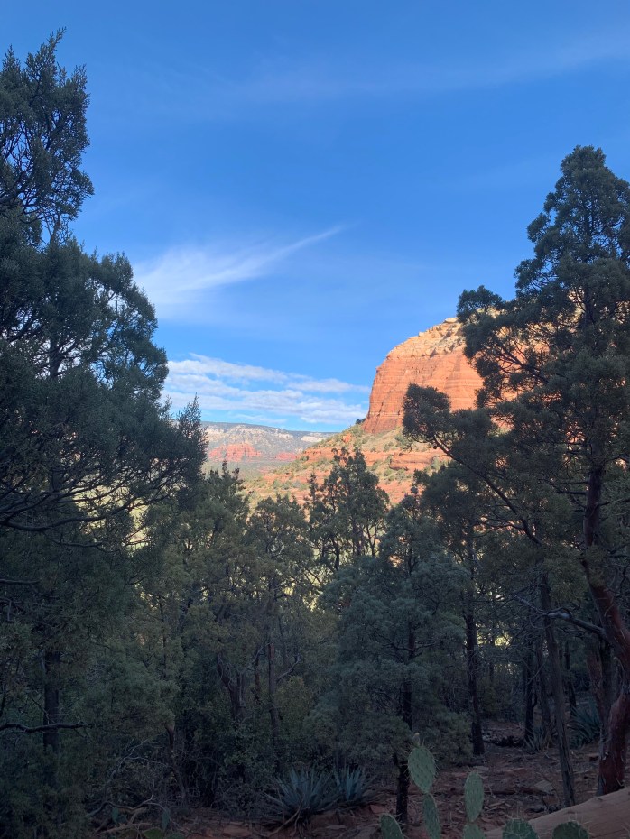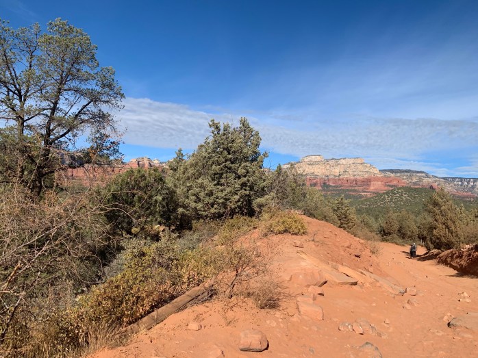 We headed out for what All Trails said was a short 3 1/2 mile out back , it was also supposed to be very easy with very little incline. Lies! Brin Mesa started on this marvelous orange trail with green trees and the awesome rocks to your right. . Everything looked amazing. Then we had a little turn and a little climb that turned out to be a lot steeper than we thought. It’s basically like climbing steps, but I wasn’t prepared for that and I was whining.