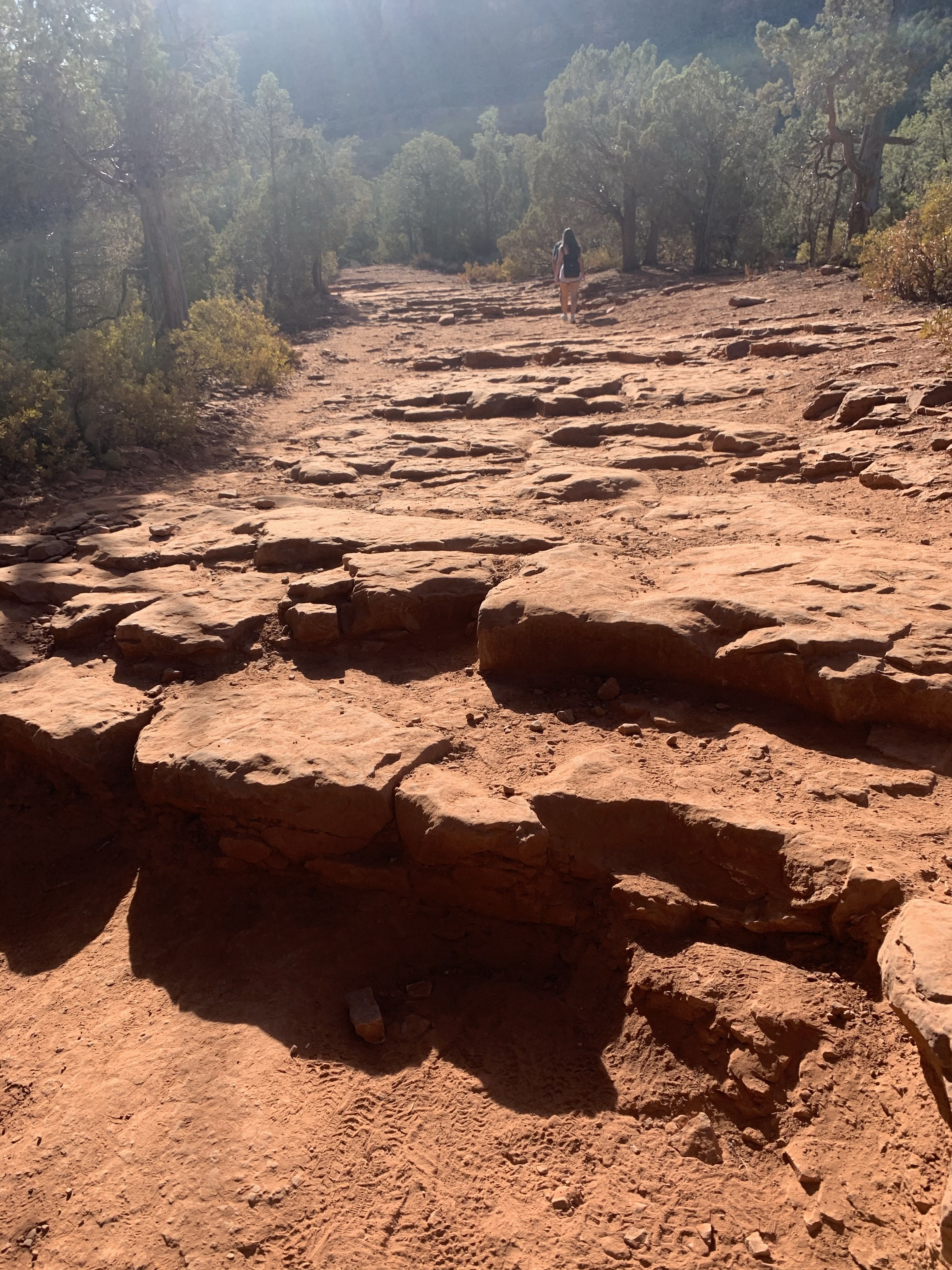 We headed out for what All Trails said was a short 3 1/2 mile out back , it was also supposed to be very easy with very little incline. Lies! Brin Mesa started on this marvelous orange trail with green trees and the awesome rocks to your right. . Everything looked amazing. Then we had a little turn and a little climb that turned out to be a lot steeper than we thought. It’s basically like climbing steps, but I wasn’t prepared for that and I was whining.
