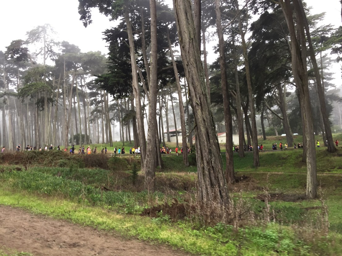 Outside of the hill right at the start, these miles were predominantly flat. We headed out through the Marina and the Presidio. The race had around 4000 runners but things felt really tight. It actually helped pull me along, looking back, these were my speediest miles. It wasn’t raining but the fog was so heavy it was misting and I realized my sunglasses were more of a hindrance than a help. I ended up carrying them for the next 8 miles. I just went with the flow and enjoyed what I could see of the sights. Parts of the course were parts of the SF marathon course so I thought I knew what I was in for. I was wrong.