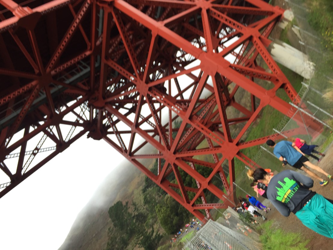 I was looking forward to running the bridge again as I was hoping I would be able to see more than last time. Unfortunately, it was just as foggy. We ran the walkways instead of the road this time and I liked that much better- it seemed less slippery. What I hadn’t counted on was the bottle necking. It hadn’t really thinned out so it was hard to pass people.. or be passed. Also, this was the race of selfies. I have never seen so many people taking pictures mid-race before. Dodging people became an art form. I was also starting to feel very tired. Once across the bridge we looped around Vista Point and down back under the bridge. #1- a downhill trail?!?! Sweet!! I ran like a 5 year old sprinting to the finish. #2- you can run under the bridge?!??! So cool!